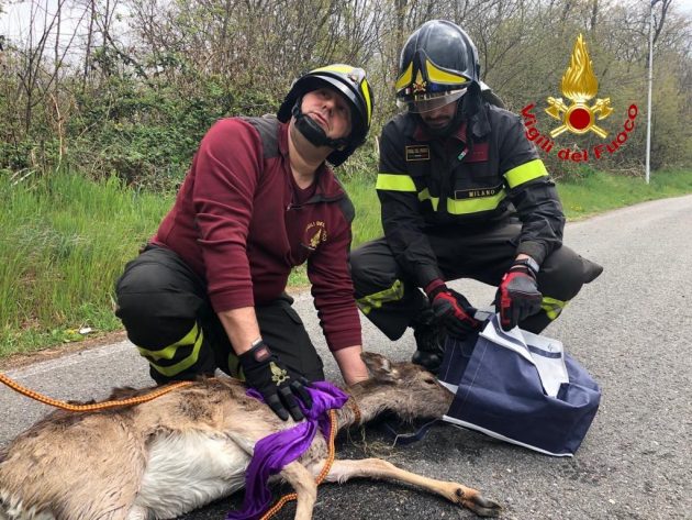 Era caduto nelle acque del Naviglio Grande di Turbigo (Milano), qualcuno lo ha notato e ha chiamato i vigili del fuoco. Due squadre sono arrivate sul posto intorno alle 12 e hanno tirato fuori un cerbiatto un po’ malconcio ma vivo.